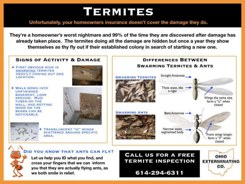 First of all, you need to know how to properly identify what a termite looks like. By the time you can see it, it will be above ground, and often can be confused for a swarming ant. Think of a cigar, long and narrow. Termites wings are each long and narrow, where as swarming ants have 2 different wing lengths and a narrow abdomen. Check out below for a document providing clear differences of a termite and an ant.